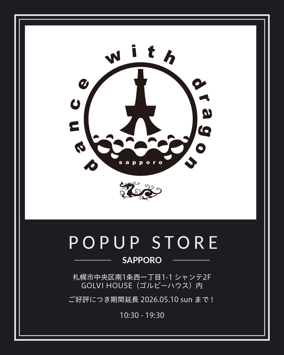 SAPPORO POPUP 期間延長! dancewithdragon 2026-04-23 with コメントはまだありません 北海道札幌市にて期間限定ポップアップストアをオープンいたします。 2026春夏コレクションの最新作を、直接お手に取ってご覧いただけます。 またPOPUP限定モックネックシャツの販売も行います。 この機会にぜひご来場くださいませ。期間 4月1日(水)~5月10日(日) 時間 10:30~19:30 住所 札幌市中央区南1条西一丁目1-1 シャンテ2F GOLVI HOUSE(ゴルビーハウス)内 取り扱いブランド <ダンスウィズドラゴン> 皆さまのご来場、スタッフ一同心より楽しみにお待ちしております。 ※在庫状況により一部取り扱いのない商品がございます。予めご了承お願いいたします。